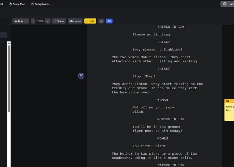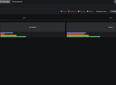 Tools like the Story Map let you know when characters, events and even certain props appear. Each scene in your script is analyzed to show how they balance action and dialog, giving you a visualization of how your script is flowing.